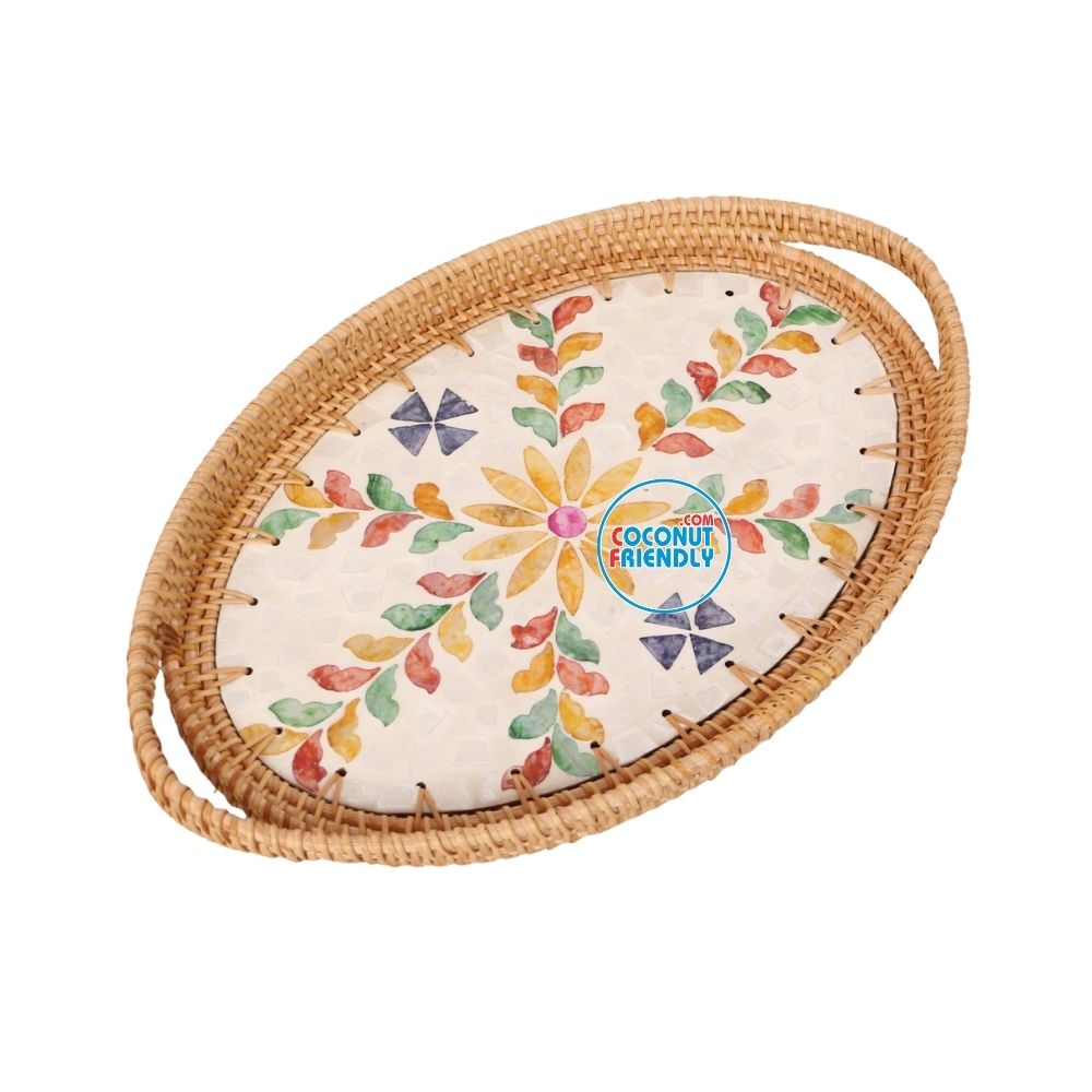Artful Oval Mother of Pearl Rattan Tray Featuring Shell Inlay Detail – TCRMT 8914C
