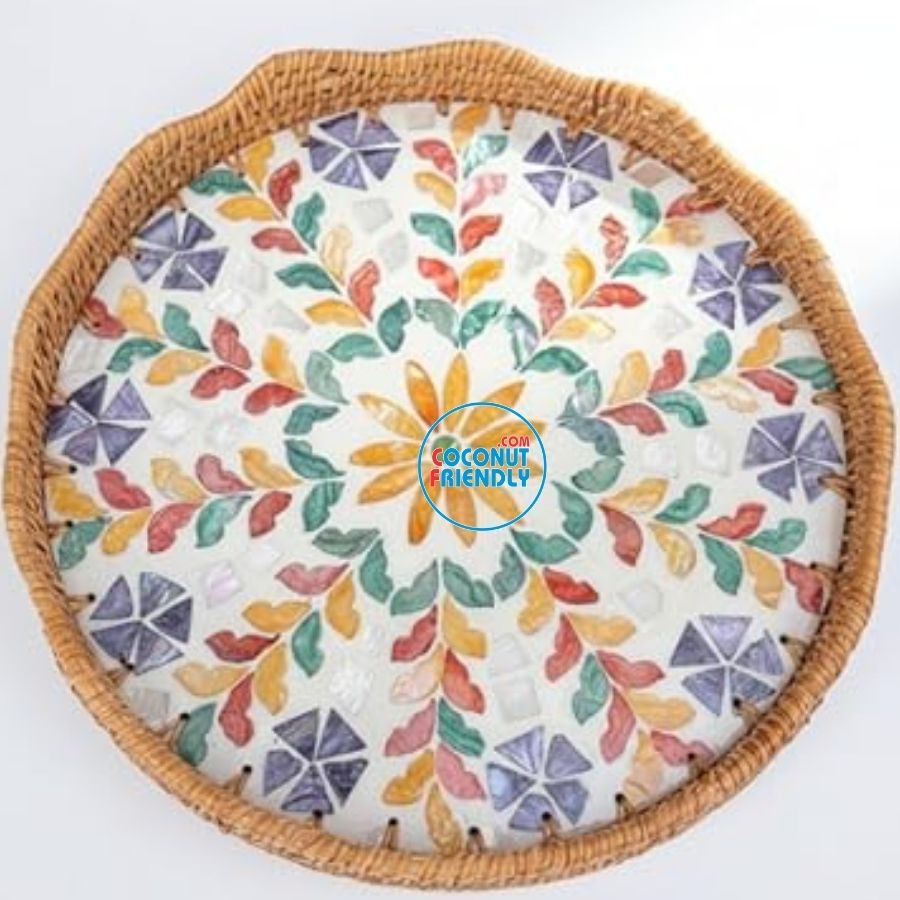 Product Name:Clean Style Round Mother of Pearl Rattan Tray With Simple Geometry - TCRMT 8881C